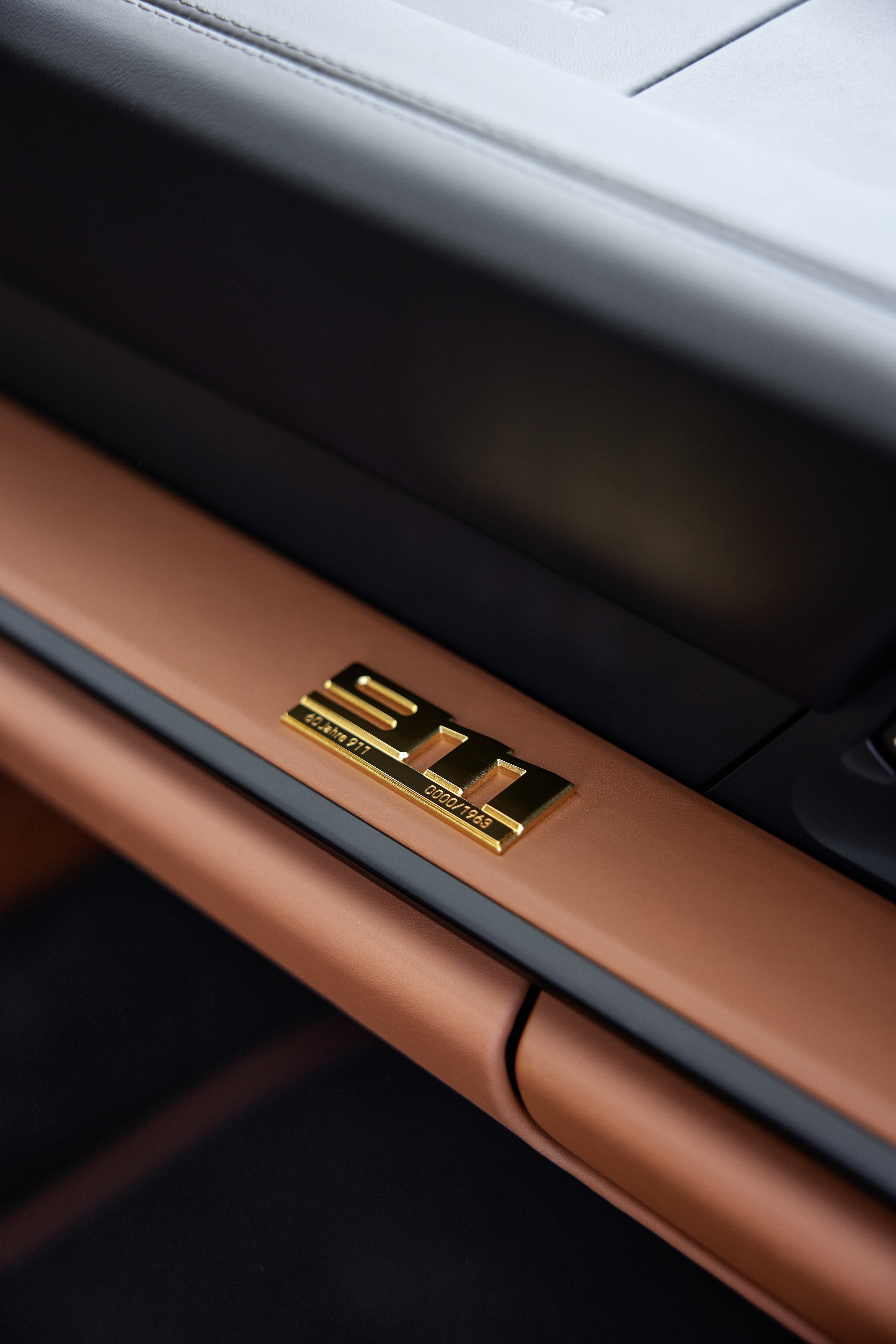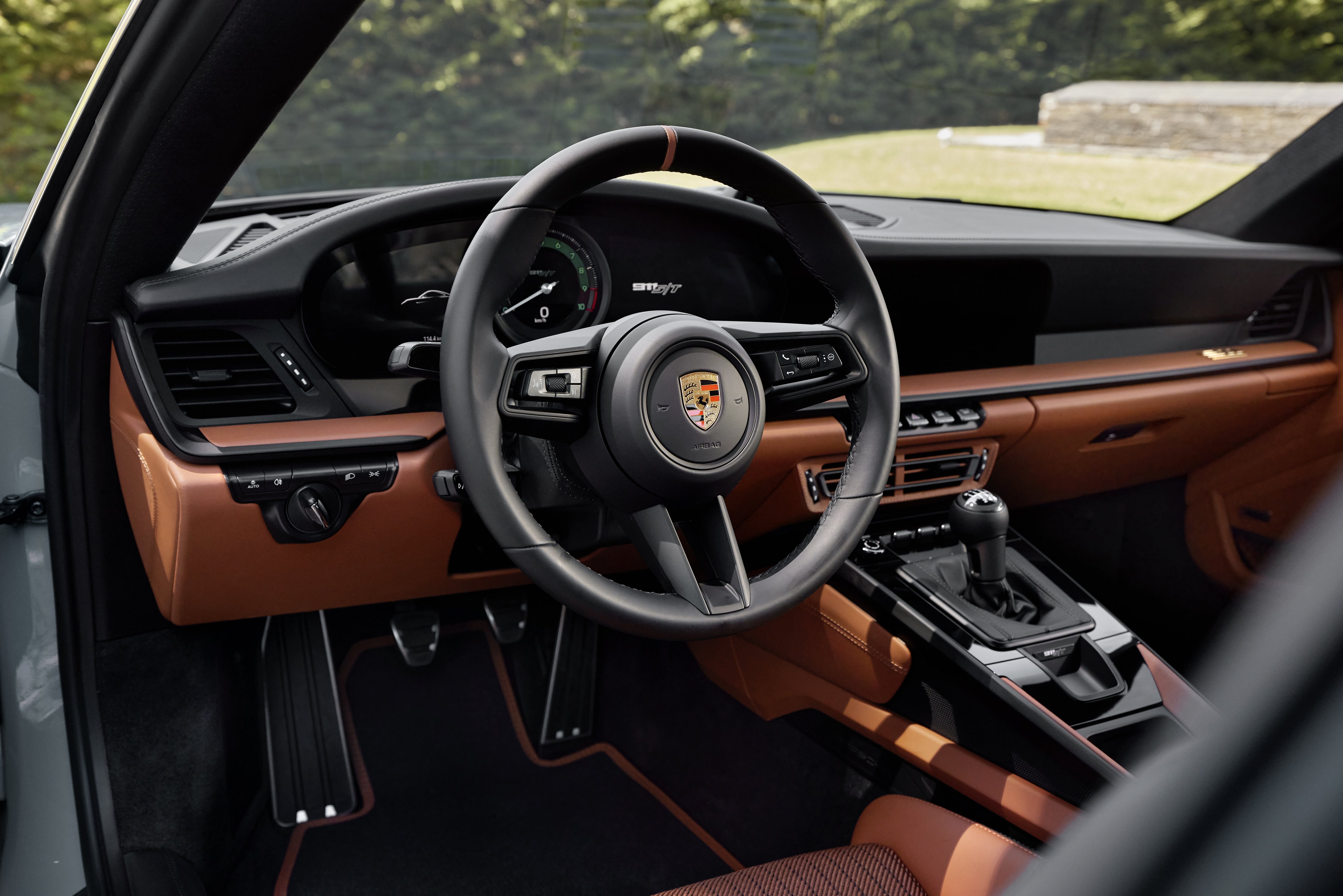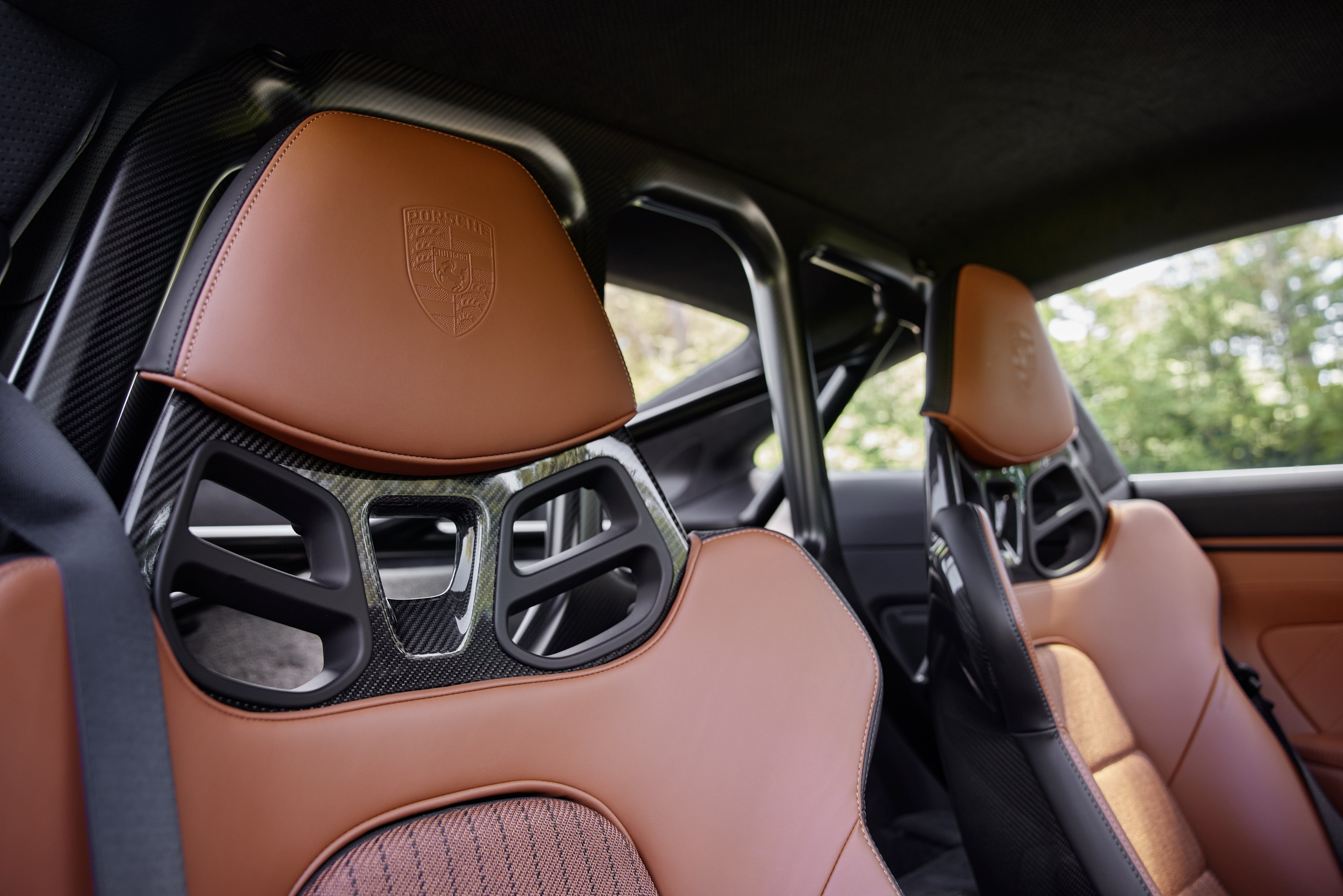 Den klassiska Porsche-vapenskölden från den allra första generationen 911, som pryder fronten på 911 S/T, navkåporna, nackskydden och bilnyckeln, framhäver de historiska rötterna. Sätena med tyg i Classic Cognac och svarta kritstrecksränder är en annan hyllning till modellens arv. Läderklädsel i tvåtons semianilin i färgen Black/Classic Cognac, innertak i perforerad Dinamica och andra detaljer från Porsche Exclusive Manufaktur avrundar Heritage-paketet. Den bakre Porsche-logotypen och 911 S/T-modellbeteckningen är guldfärgade.