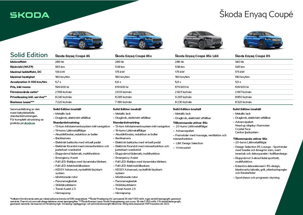 Vid sidan av det normala modellprogrammet erbjuds Enyaq och Enyaq Coupé i ett ytterligare utförande; Enyaq Solid Edition. Ett utförande som innebär både central prissättning från Škoda Sverige där kunden får fram ett enhetligt pris på skoda.se direkt och möjligheten att göra fler steg i kundresan online.