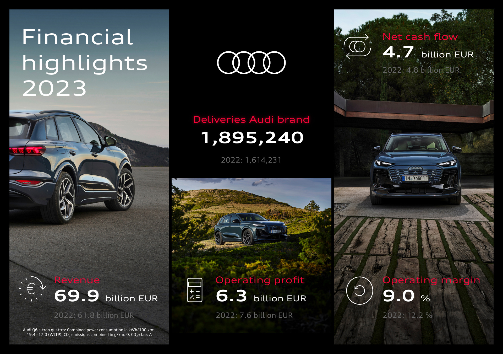 Audi-koncernen uppnådde under utmanande ekonomiska förhållanden ett robust resultat för räkenskapsåret 2023. Intäkterna ökade med 13,1 procent till 69,9 miljarder euro, rörelseresultatet uppgick till 6,3 miljarder euro och rörelsemarginalen till 9,0 procent. Nettokassaflödet var nästan i nivå med föregående år på 4,7 miljarder euro. Med ett stort antal nya modeller kommer Audi att stärka och utöka sitt produktutbud avsevärt under de kommande åren. Världspremiären för helt eldrivna Audi Q6 e-tron, den första modellen på den nya Premium Platform Electric (PPE), inleder en serie produktlanseringar. Fler än 20 nya modeller planeras för 2024 och 2025.