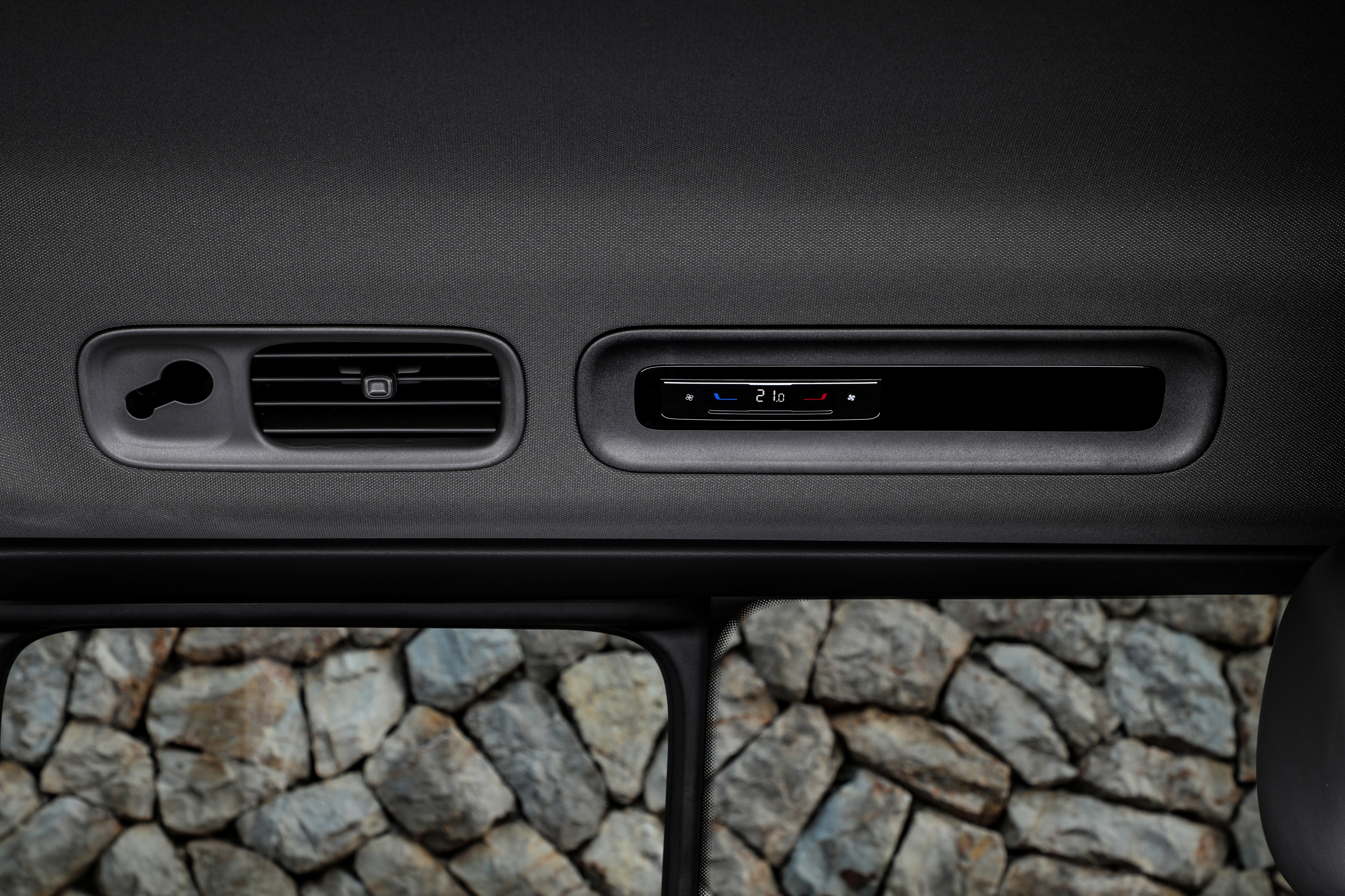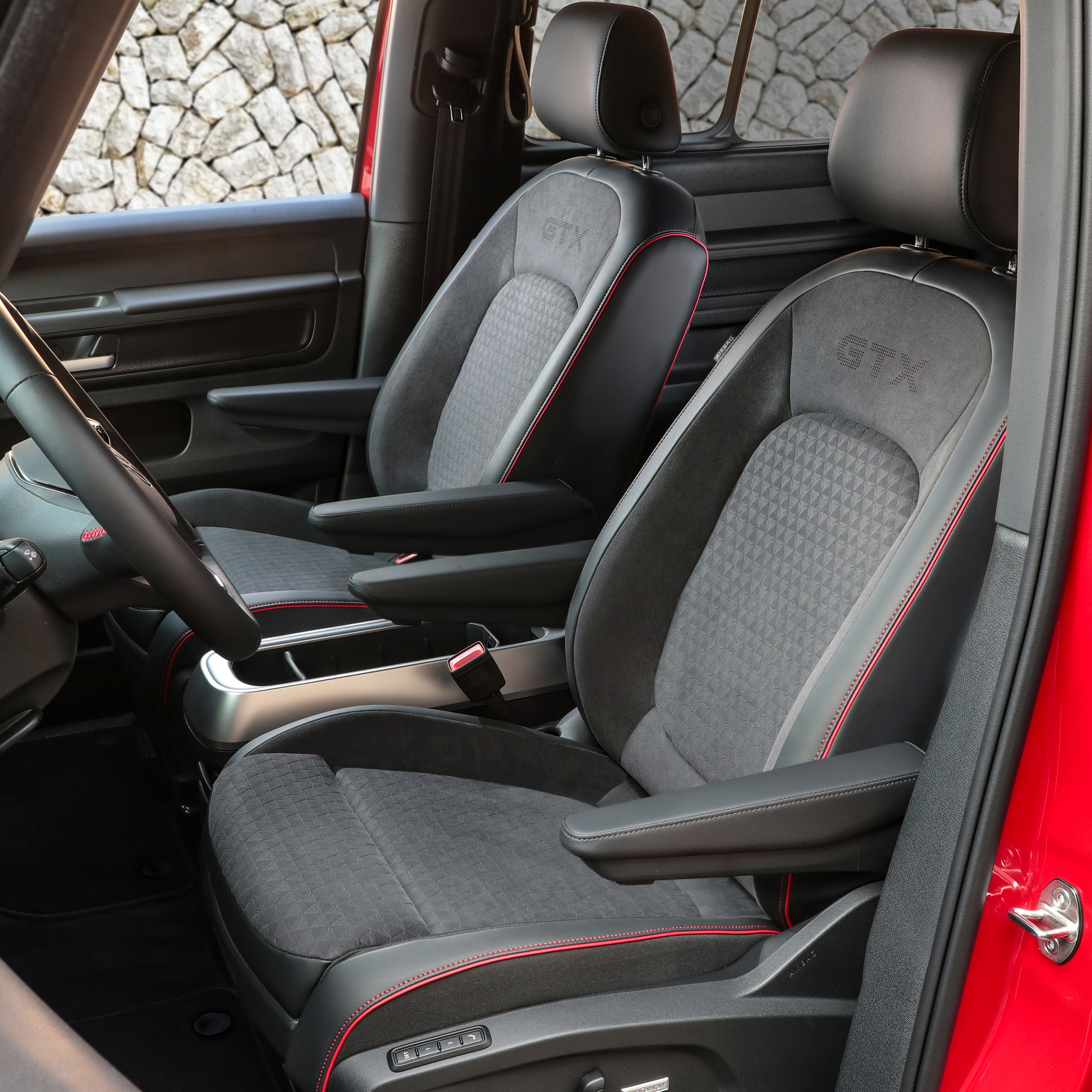 GTX interiör. Volkswagen Transportbilar har även anpassat interiören genom mörka färgtoner som framhäver den sportiga karaktären hos de mest kraftfulla ID. Buzz-versionerna. Till exempel båda ID. Buzz GTX-versionerna – med kort och lång hjulbas – är de enda versionerna i produktlinjen som är utrustade med svart takklädsel. Sätena har också GTX-specifik design. Fram används elektriskt inställbara komfortsäten med minnesfunktion. Sätena pryds av klädsel i svart mikrofleece ArtVelour Eco med nytt rombmönster samt röda kontrastsömmar. Röda korssömmar är också ett kännetecken på multifunktionsratten, tillsammans med röda detaljer på instrumentpanelen och en GTX-logotyp.