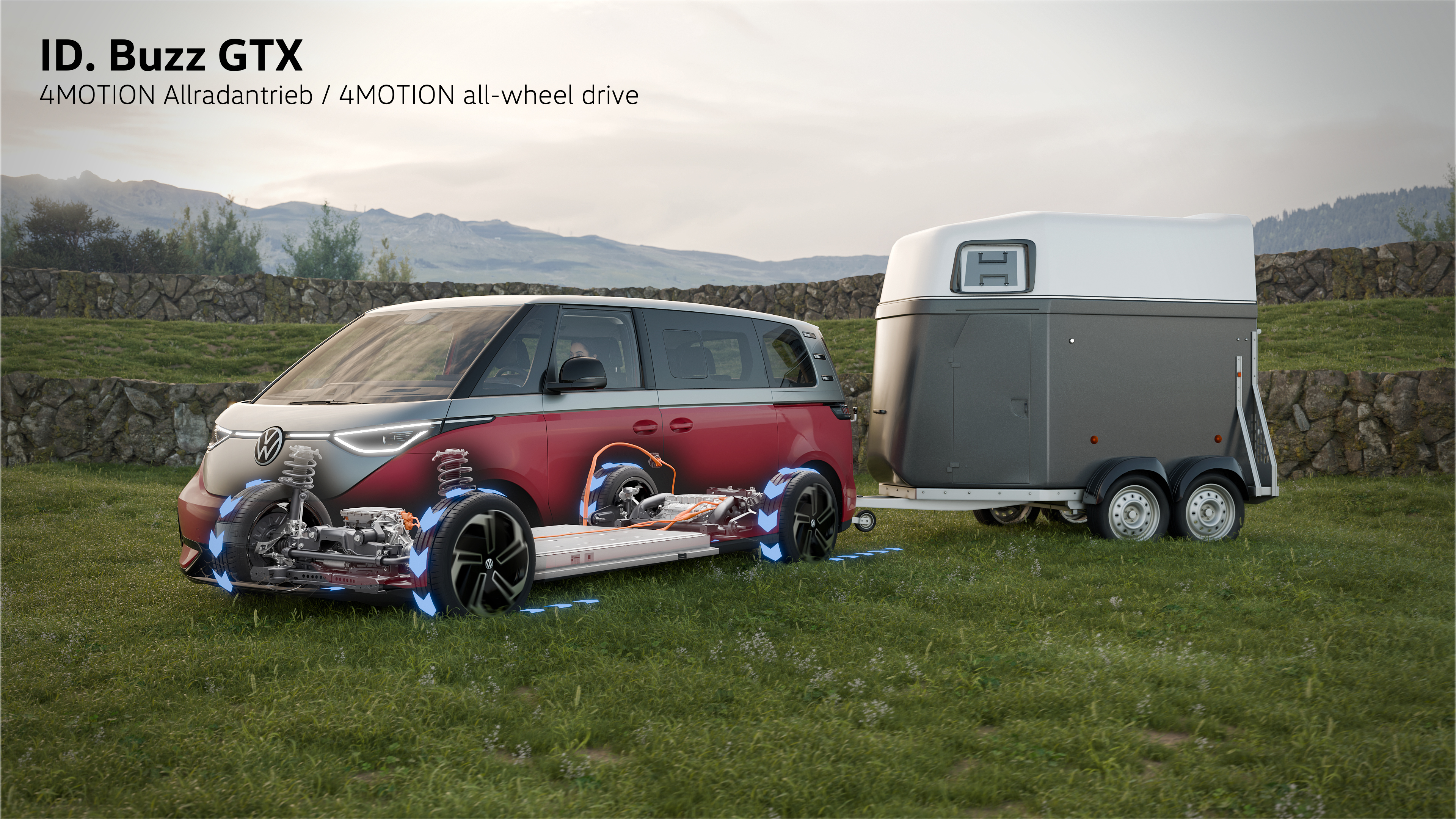 Elektrisk dragbil. Tack vare det nya drivsystemet har även den maximala släpvagnsvikten ökat. ID. Buzz GTX med standardaxelavstånd får dra maximalt 1 800 kg (bromsad, åtta procents lutning), medan ID. Buzz GTX med lång hjulbas har en maximal släpvagnsvikt på 1 600 kg. Den maximala släpvagnsvikten har därmed ökat med 800 kg respektive 600 kg. Det elektriska 4MOTION-systemet ger stora dragkraftsfördelar, särskilt vid körning med släpvagn på vått eller löst underlag.