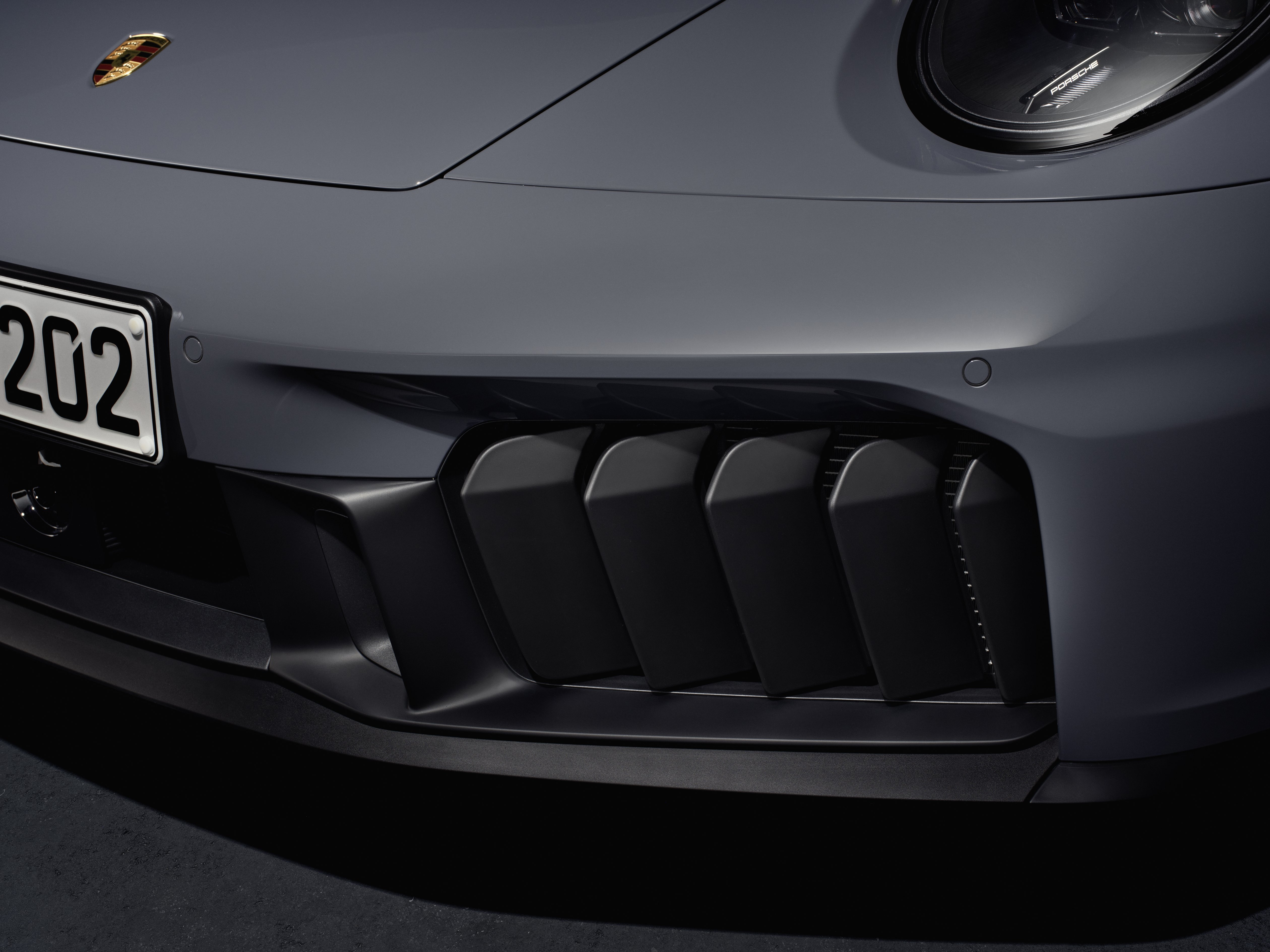 På 911 Carrera GTS-modellerna har fronten fem vertikalt placerade aktiva kylluftspjäll som är synliga utifrån och ytterligare en dold lucka på varje sida. För första gången i 911 kompletteras dessa med adaptiva frontdiffusorer i underredet, som styrs tillsammans med kylluftspjällen. Dessa element styr luftflödet efter behov: När effektbehovet är minimalt optimerar stängda luckor aerodynamiken. När effektbehovet är högt – till exempel vid bankörning – leder spjällen stora mängder luft till bilens kylare. Sensorerna för körhjälpssystemen sitter nu bakom en högblank yta under nummerskylten.