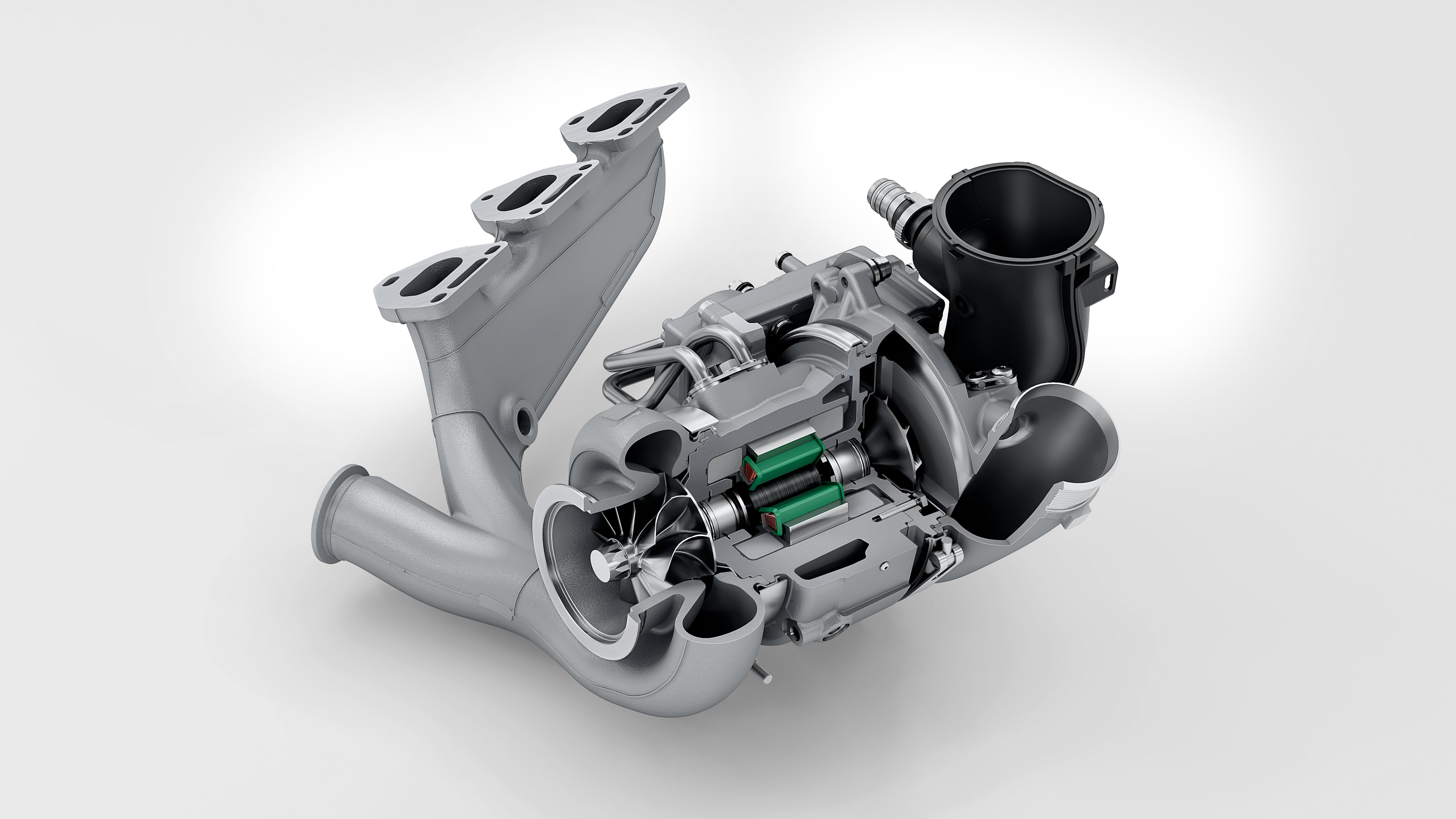 Det lätta och kraftfulla T-Hybrid-systemet har en nyutvecklad elektrisk turboladdare. En integrerad elmotor, placerad mellan kompressorn och turbinhjulet, ser till att turboaggregatet omedelbart kommer upp i hastighet. Därigenom byggs laddtrycket upp omedelbart. Dessutom fungerar elmotorn i turboaggregatet som generator. Den genererar en elektrisk effekt på upp till 11 kW (15 hk) som utvinns ur avgasflödet. Den elektriska turboladdaren utan wastegate möjliggör användning av endast en turboladdare i stället för de tidigare två, vilket ger en mer dynamisk och responsiv effektutveckling.