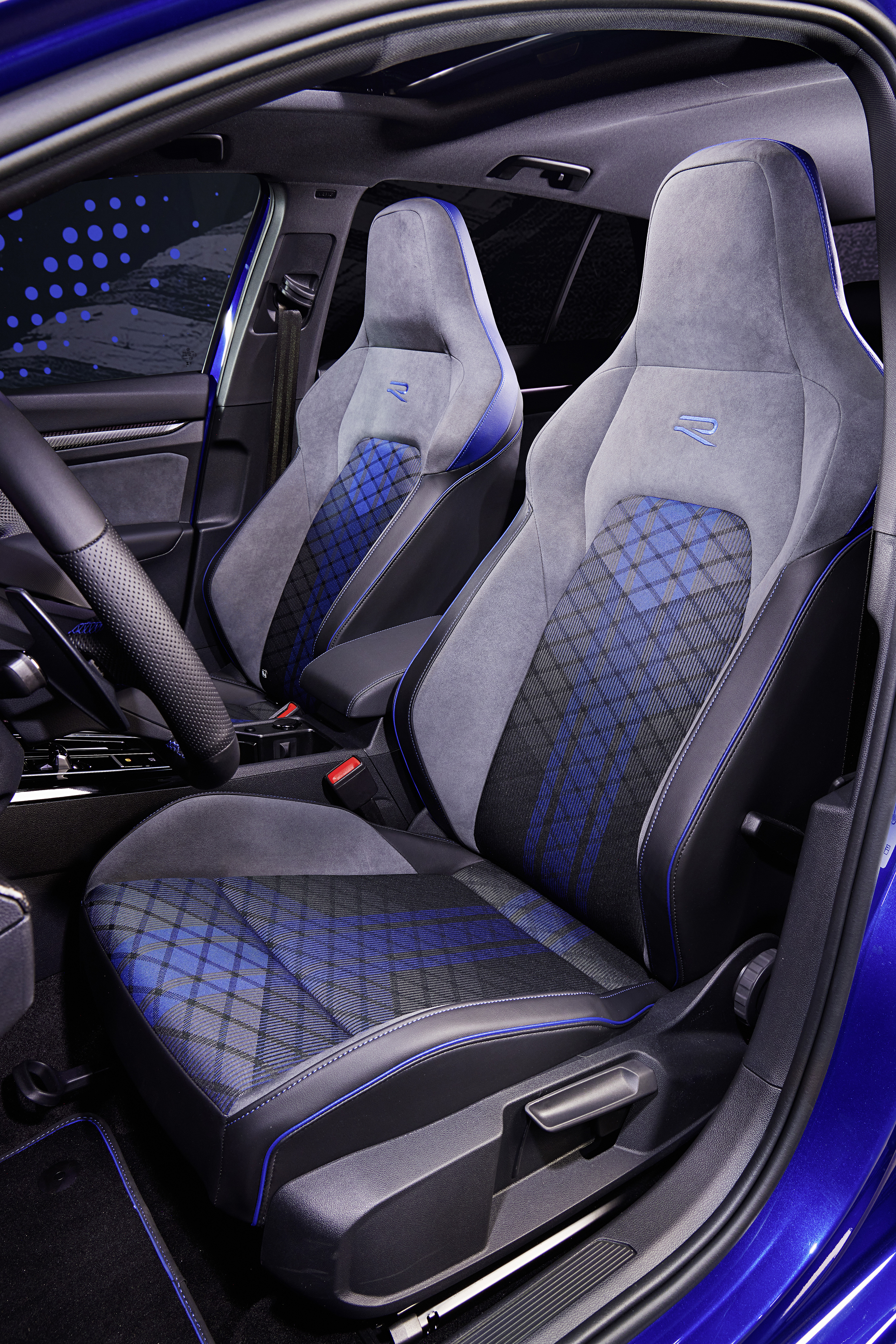 Interiören i Golf R-versionerna är ergonomiskt anpassad efter föraren och exklusivt förfinad i ”R”-stil. Föraren och passageraren fram sitter i sportstolar med integrerade nackskydd. Som tillval finns klädsel i svart nappa med detaljer i kolfiberoptik med blå applikationer i sidoområdet och ”R”-logotyp i ryggstödet. Interiörapplikationer i äkta kolfiber finns som tillval. Dessa utrustningsdetaljer understryker det exklusiva helhetskonceptet hos nya Golf R.