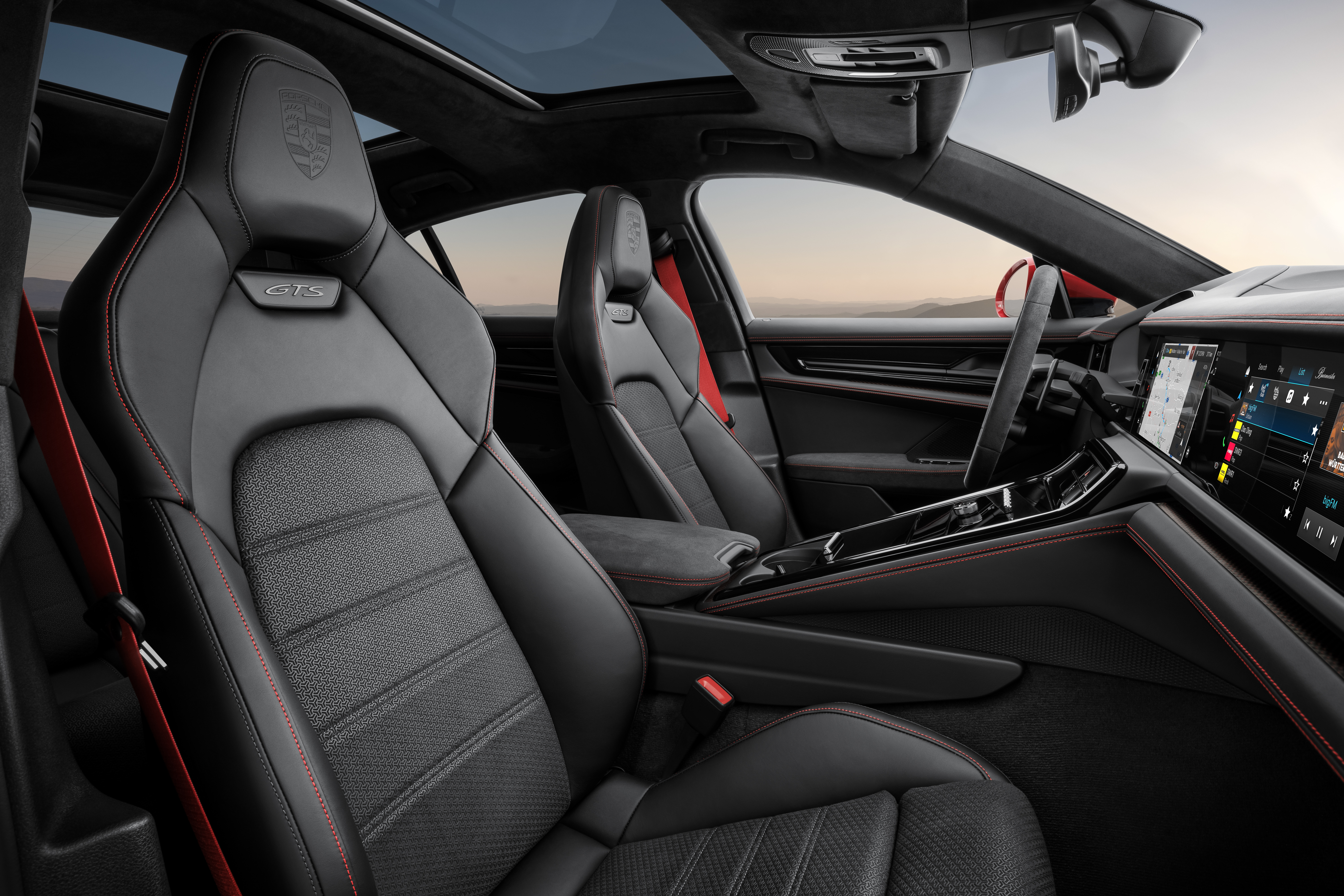 Invändigt är Porsche överdådig med sitt mockaliknande Race-Tex. Materialet täcker innertaket, armstöden och dörrpanelerna samt mittpanelen på de adaptiva sportstolarna med 18-vägsinställning. Porsche erbjuder även två GTS-specifika interiörpaket i Carmine Red eller Slate Grey Neo. Dekorsömmar och bälten finns även i färgen på det valda paketet. Det finns även ett interiörpaket i matt kolfiber. I standardutrustningen för Panamera GTS ingår även en BOSE® ljudanläggning och Sport Chrono-paketet med stoppur och push-to-pass-funktion.
