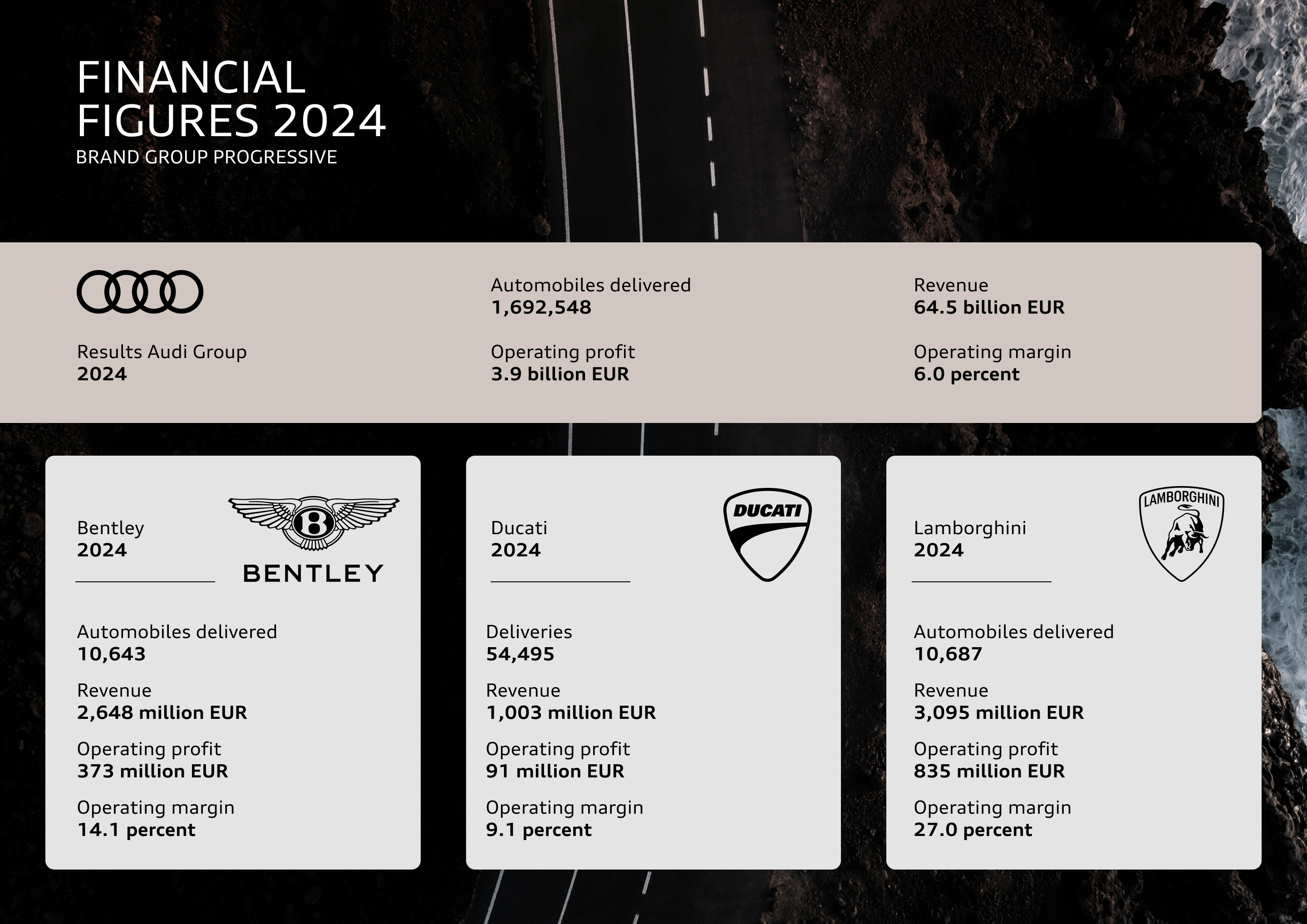 Utmanande ekonomiska förhållanden, en tuff marknadsituation och i vissa fall begränsad leveranskapacitet påverkade leveranssiffrorna under det gångna året. Totalt levererade varumärkesgruppen Progressive*, som består av Audi, Bentley, Lamborghini och Ducati, 1 692 548 (2023: 1 918 912) bilar och 54 495 (2023: 58 224) motorcyklar. Antalet levererade modeller av märket Audi minskade med 11,8 procent till 1 671 218. I denna siffra ingår 164 480 helt eldrivna bilar (-7,8 procent).