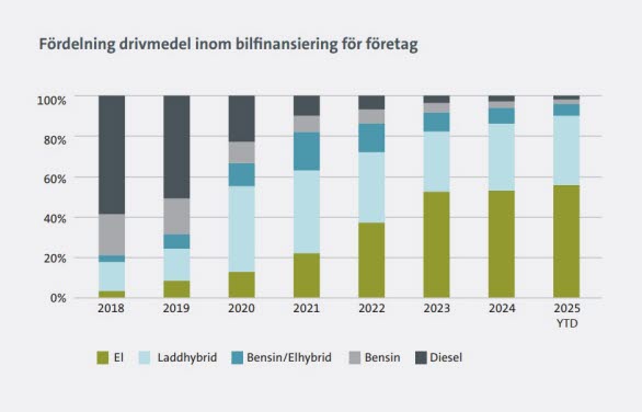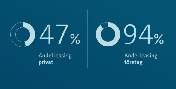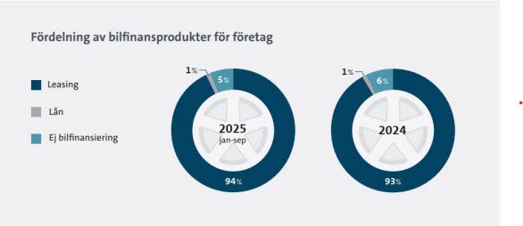 Andelen leasing i företagssektorn ökade med en procentenhet januari till september i år jämfört med 2024, vilket innebär att 94 procent av de svenska företagen väljer leasing för att finansiera sin bilflotta. Laddbara bilar fortsätter att öka sin andel och står för nästan 90 procent av företagssektorns leasing av personbilar. Motsvarande andel laddbara bilar i den offentlig sektorn låg under 50 procent samma period.