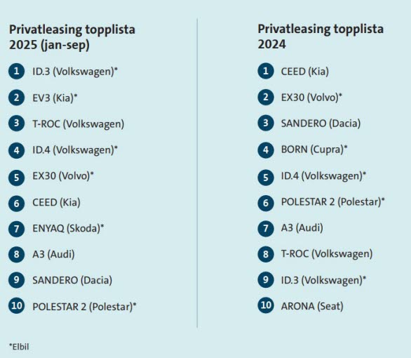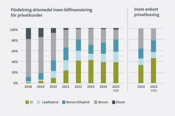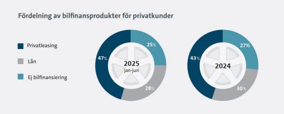 Fler hushåll väljer privatleasing. Antalet nya privatleasade bilar steg med 23 procent januari-september jämfört med samma period 2024. Privatleasing fortsätter att öka sin andel på den svenska bilmarknaden. Under januari till september i år valde 47 procent av hushållen att finansiera sin nya bil genom privatleasing, vilket är en ökning med 4 procentenheter jämfört med 2024. Om man bara tittar på det tredje kvartalet i år låg andelen privatleasing på nästan 50 procent. Ökningen innebär att privatleasing nu har motsvarande andel som 2021, innan räntor och inflation steg till högre nivåer
