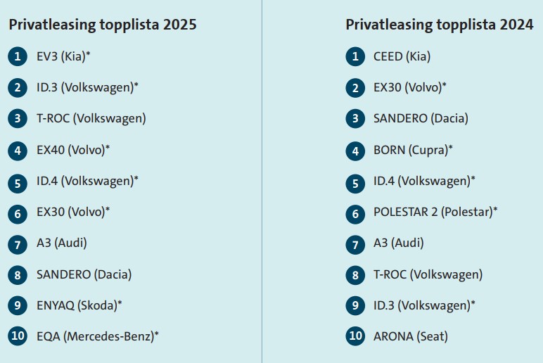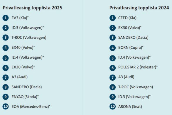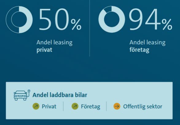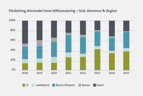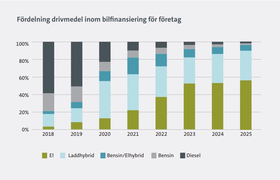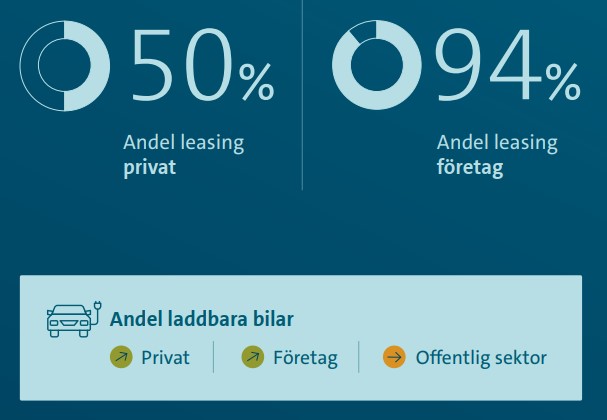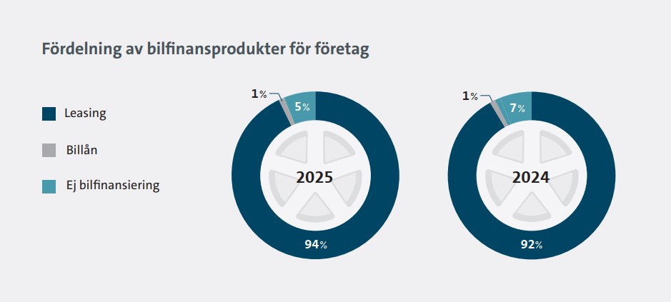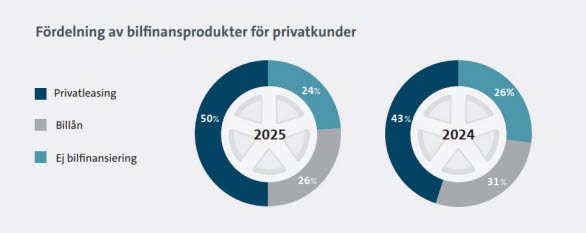 Antalet nya privatleasade bilar i Sverige steg med 25 procent under 2025 jämfört med 2024. Tillväxten för privatleasing var kraftig med tanke på att hela bilmarknaden i Sverige utvecklades svagt 2025 med en tillväxt på enbart 1,3 procent. Andelen laddbart var 59% av nya bilar på privatmarknaden för bilfinansiering, vilket är en rekordhög nivå för husållen. Även företagen är på sin högsta andel laddbarat och står för 90 procent av de företagsleasade nya personbilarna.