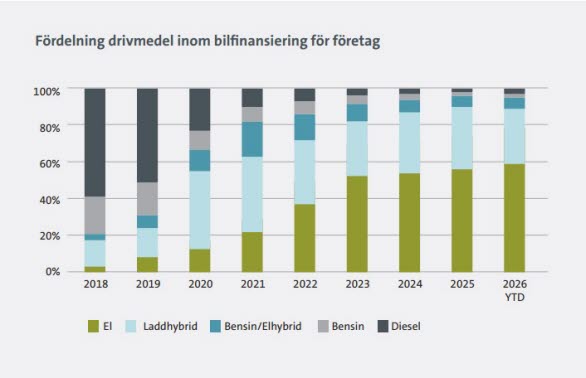Lån och leasing fortsätter att spela en stor roll för övergången till elbilar. Lån och Privatleasing driver upp andelen nya elbilar på privatmarknaden där de renodlade elbilarna nu är upp i 47 procent. På företagsmarknaden är andelen elbilar nu nästan 60 procent bland de företag som väljer leasing. Andelen leasing på företagsmarknaden ökade med tre procentenhetertill 95 procent. Av de leasade företagsbilarna är nästan nio av tio laddbara